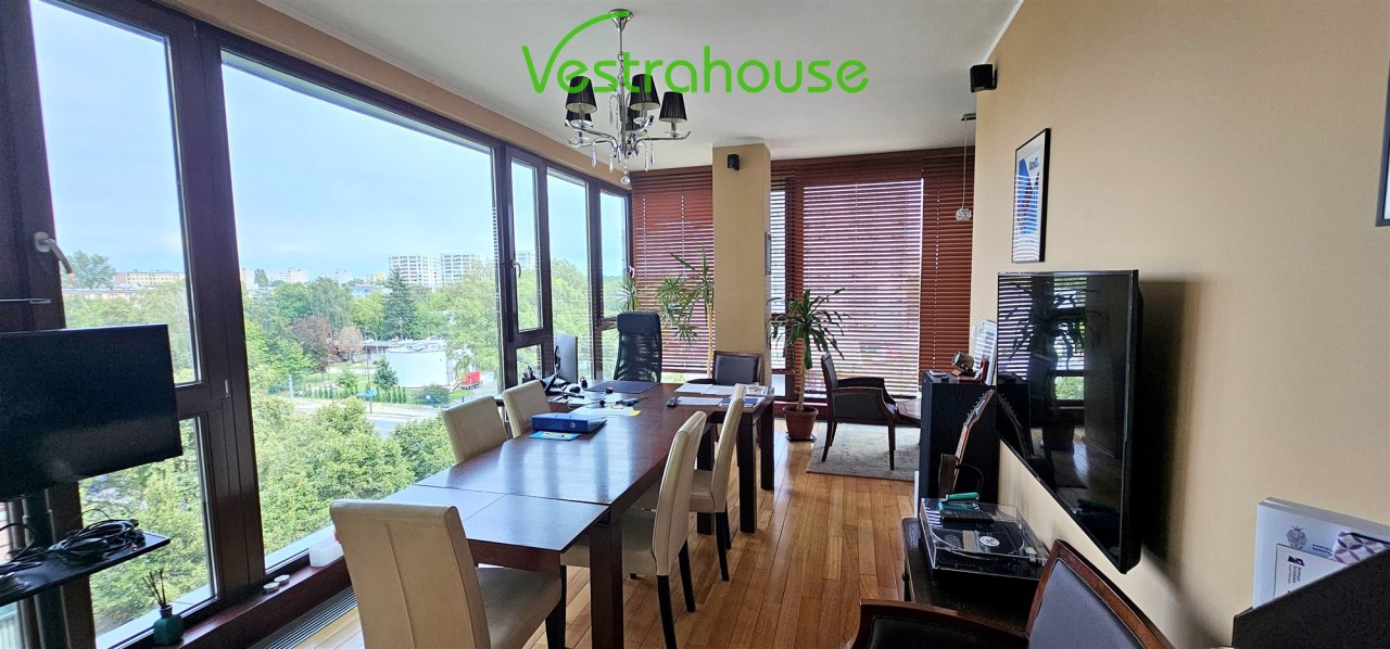 Na 5. piętrze nowoczesnego budynku z windą i ochroną 24/7 znajduje się jasny, przestronny i funkcjonalnie zaprojektowany apartament o powierzchni 85,9 m² z loggią (7 m²) oraz przeszklonym narożnym salonem z widokiem na ulicę Grójecką.