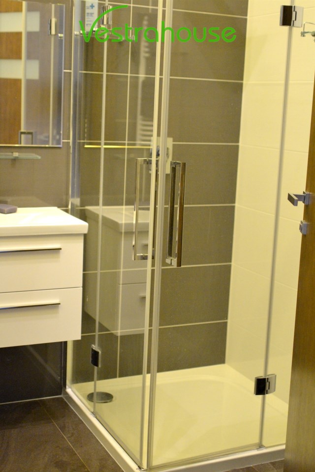 • Łazienka – 5,3 m² (z prysznicem typu walk-in, WC, umywalką, lustrem i miejscem na pralkę)